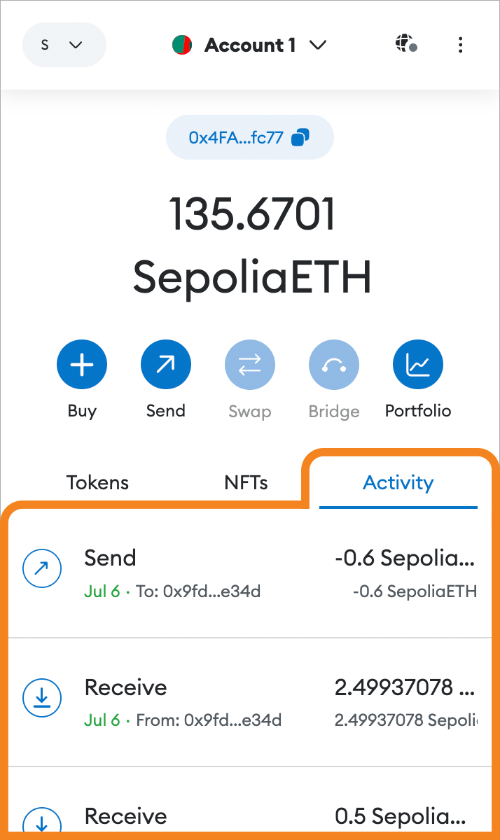 - کیف پول متامسک خود را باز کنید و روی تب «Activity» بزنید. در این قسمت مشخص شده که شما ارسالکننده بودید یا دریافتکننده.